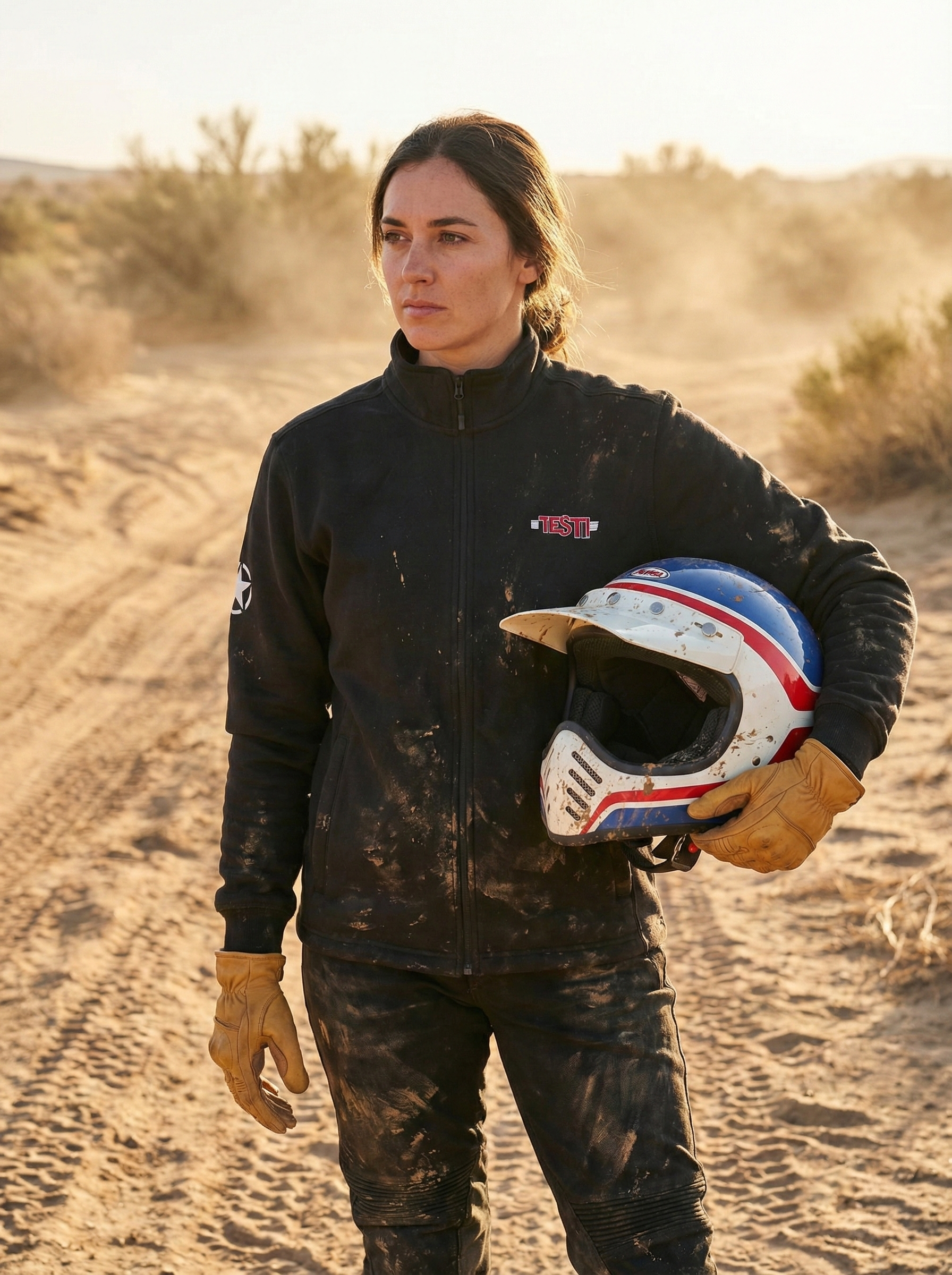 Shown here worn in real desert conditions, the piece naturally takes on dust and wear, reinforcing its understated, functional aesthetic rather than a styled, showroom look. It works equally well worn open over a T-shirt or zipped up as a light outer layer.